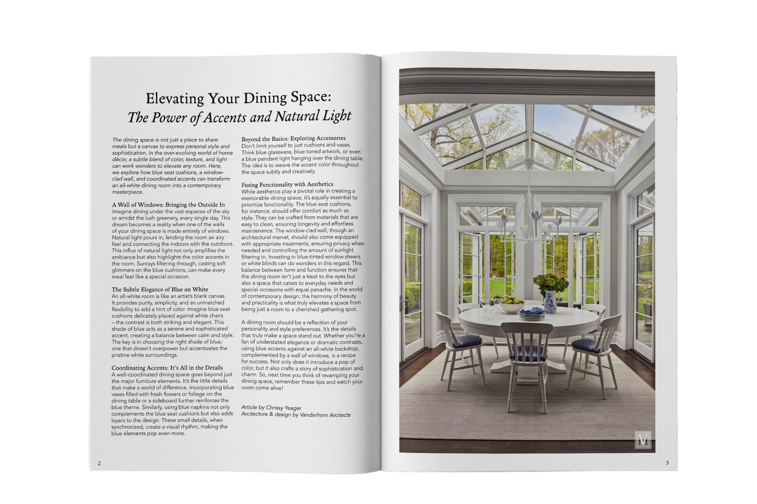 I wanted to focus on communicating luxury and sophistication. This magazine shows well-made, designed, and decorated houses. I chose too include both interior and exterior photos of homes because the exterior photos provide our readers with a holistic view of the property and the interior photos bring more of a personal touch.