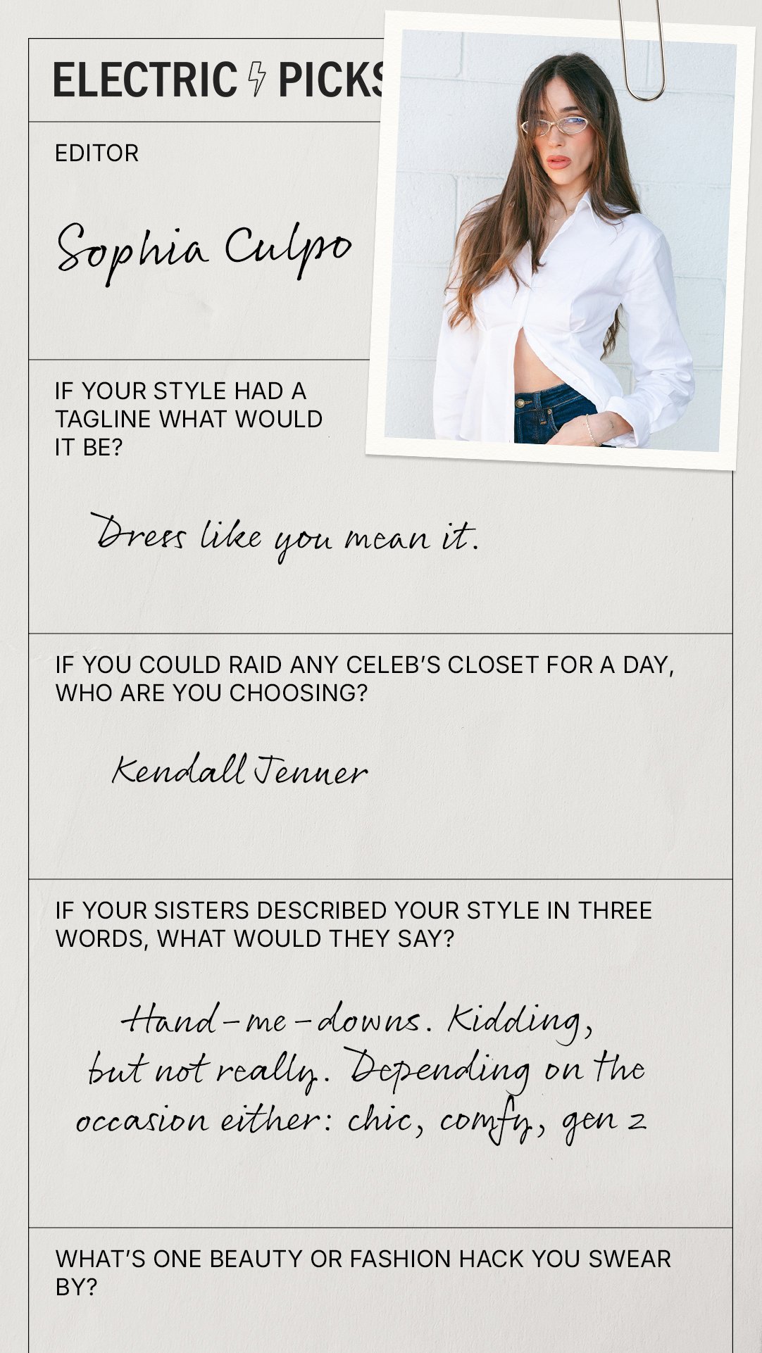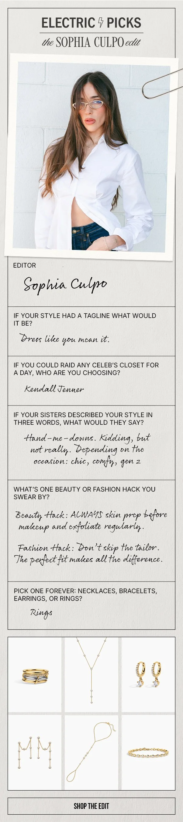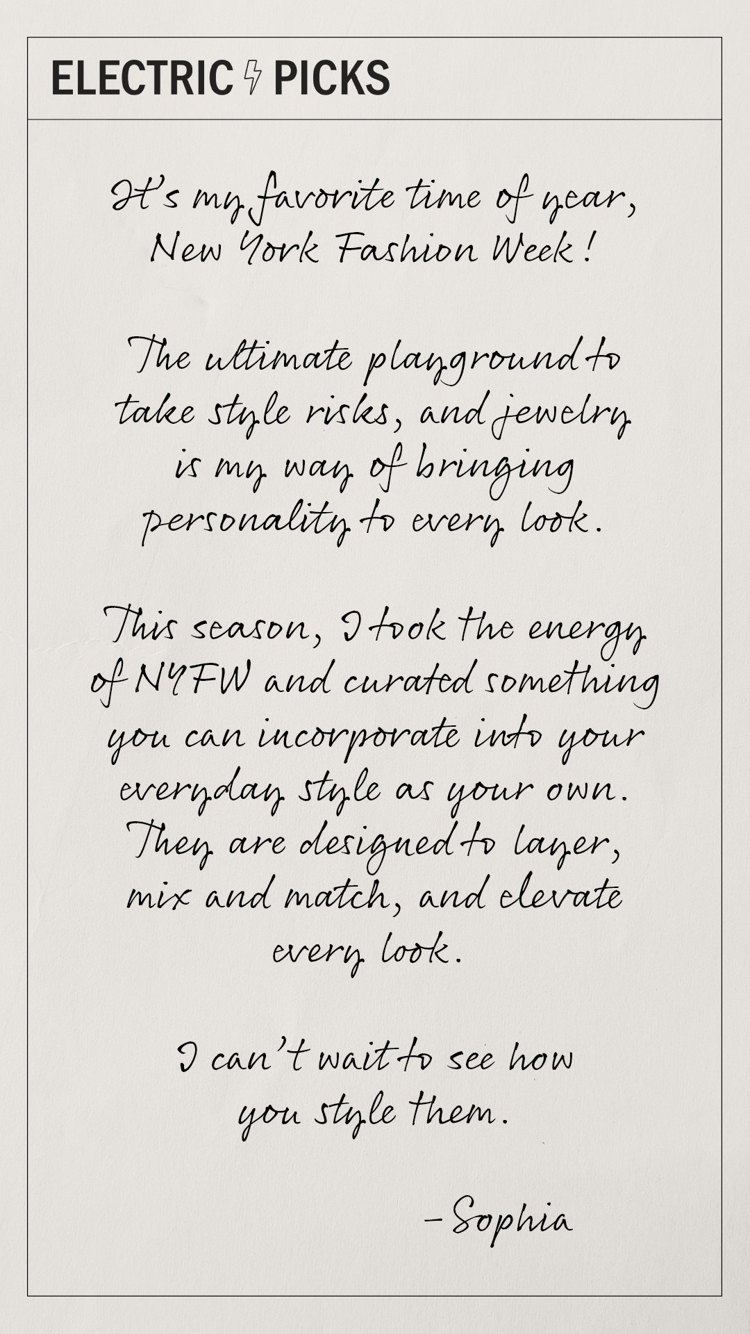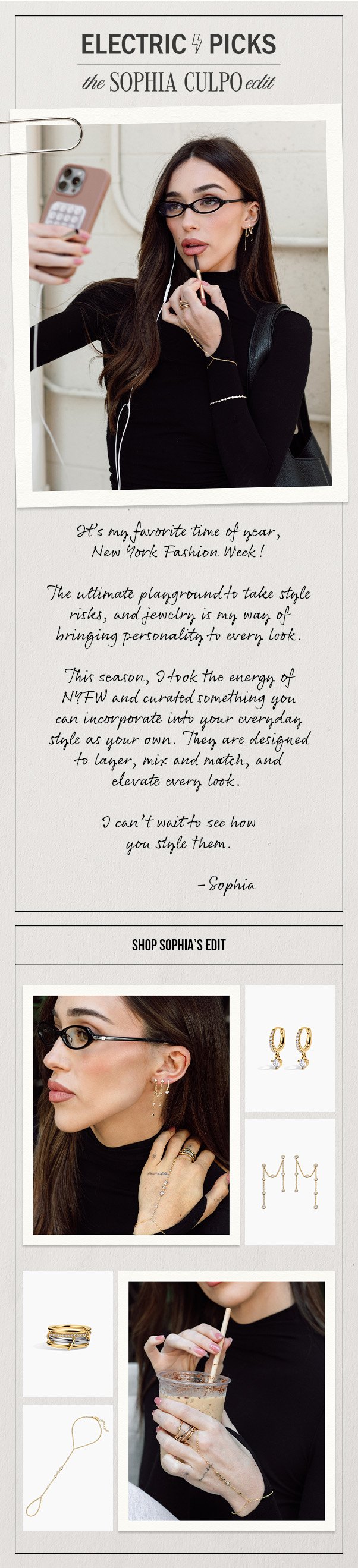 THE SOPHIA CULPO EDITElectric Picks partnered with Sophia Culpo for an exclusive New York Fashion Week jewelry edit, featuring her hand-selected favorite pieces styled around a chic, city-ready aesthetic that blends elevated everyday staples with statement accents. For this launch, I developed all digital marketing assets, including Instagram stories, email campaigns, and web graphics to showcase the curated collection and drive excitement around the edit.